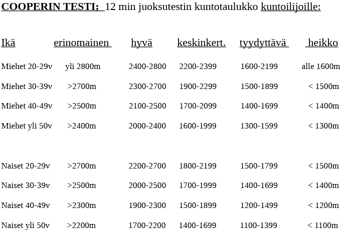 Yleisesti käytetty suomalainen Cooper-testin viitearvotaulukko, joka perustuu: